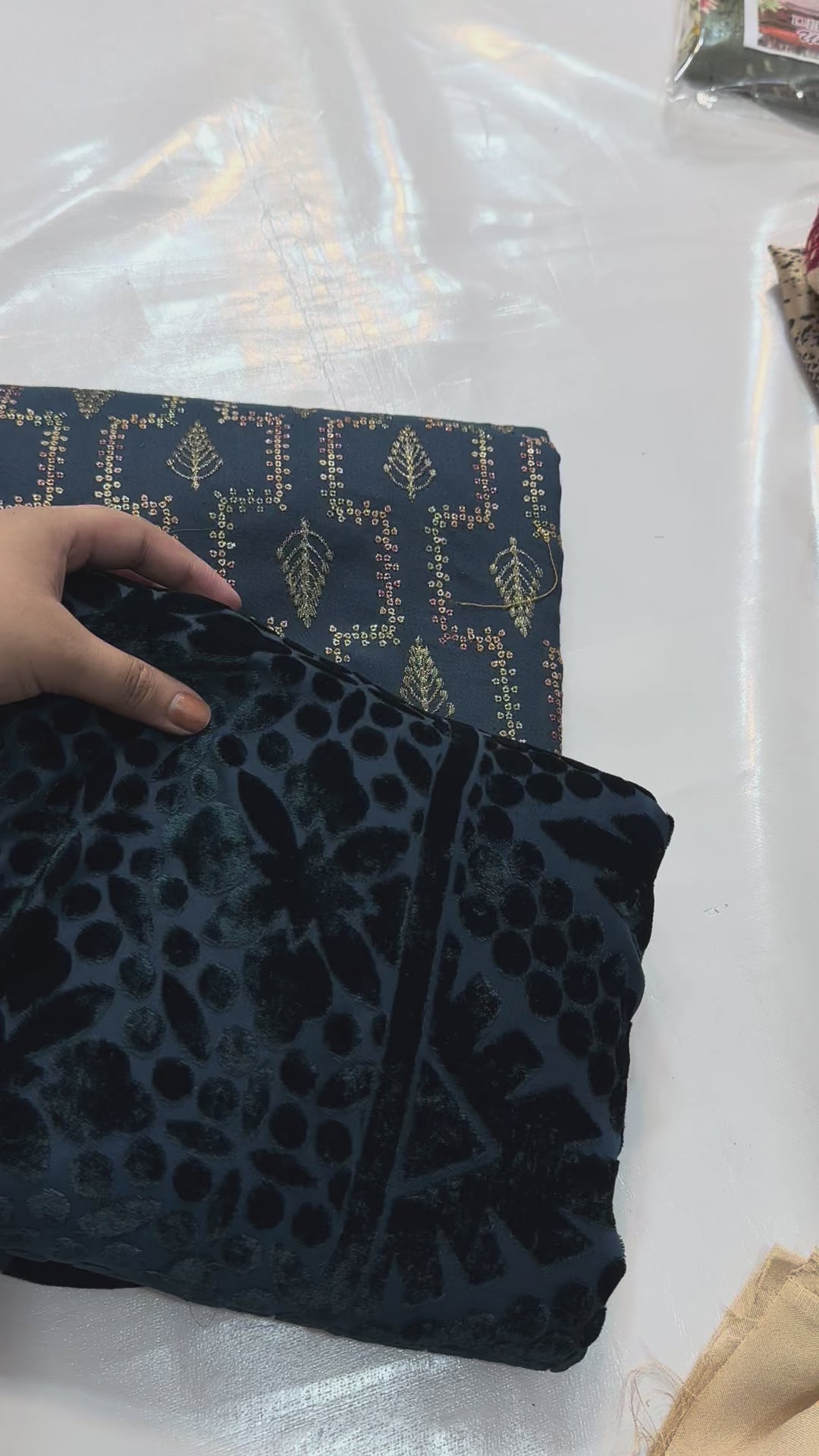 Elevate your winter style with this 3-piece dhank wool ensemble, featuring a front beautifully adorned with soft sequin embroidery for a touch of sparkle. The back and sleeves carry delicate embroidery that adds subtle charm, while the plain trouser completes the look with understated elegance — perfect for graceful winter occasions.
