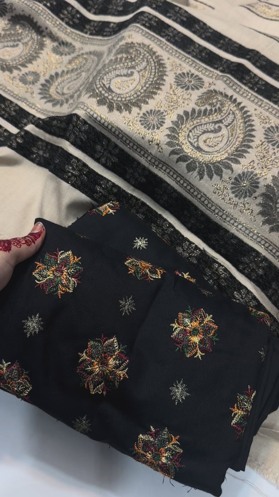 This elegant black 3-piece outfit features a multi-thread embroidered front with embroidered back and sleeves, paired with a plain trouser for a balanced, refined look. The ensemble is completed with a luxurious pashmina wool velvet jacard shawl, adding a touch of warmth and sophistication — perfect for the winter season.