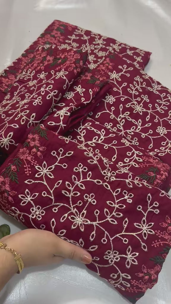 Elegant maroon 2-piece outfit by Johra, crafted from premium dhank wool fabric. The shirt features a full chickenkari boring embroidered front with embroidered back and sleeves, adding a refined traditional charm. Paired with a plain trouser, this ensemble perfectly blends warmth, style, and sophistication for the winter season.